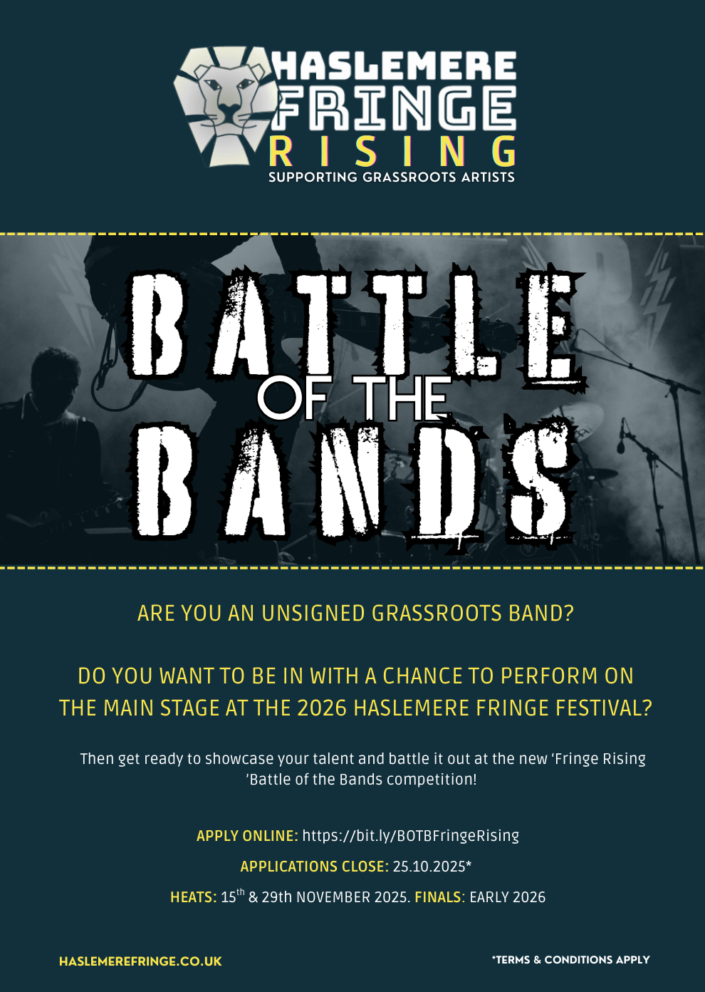 The winners of the Battle of the Bands will perform on the main stage at the Haslemere Fringe Festival in July 2026. Previous performers at the fringe have included; The Lottery Winners, Sophie Ellis-Bexter, Daniel Bedingfield, Blue, The Feeling, Rebecca Ferguson and many more!
